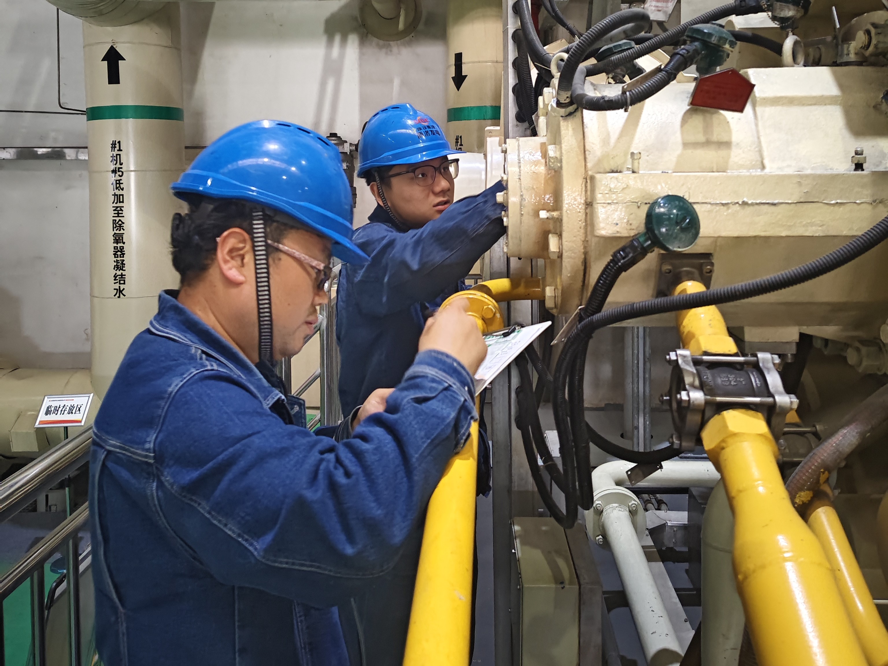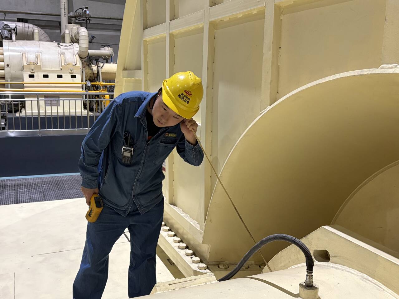 “高温天设备‘脾气’大,多走一圈、多看一眼,才放心。”8月的汽机房,轰鸣的机器声与热浪交织,这里的体感温度超过50℃,堪比巨型桑拿房。汽机巡检闵旺手持测温枪,弯腰检查汽轮机轴承温度,豆大的汗珠顺着安全帽带滑落。“轴承温度正常,但振动值有轻微波动,得再盯紧点。”他做好记录后,转向下一个巡检点,继续着两小时一次的定期巡检。