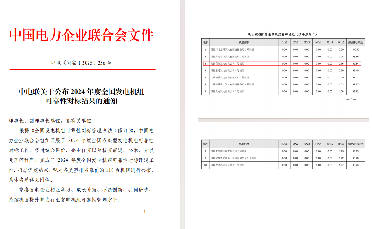近日,中国电力企业联合会公布了2024年度全国发电机组可靠性对标结果,公司#1机组以综合评价系数99.84的优异成绩,位列600MW等级煤粉炉机组全国第三名。